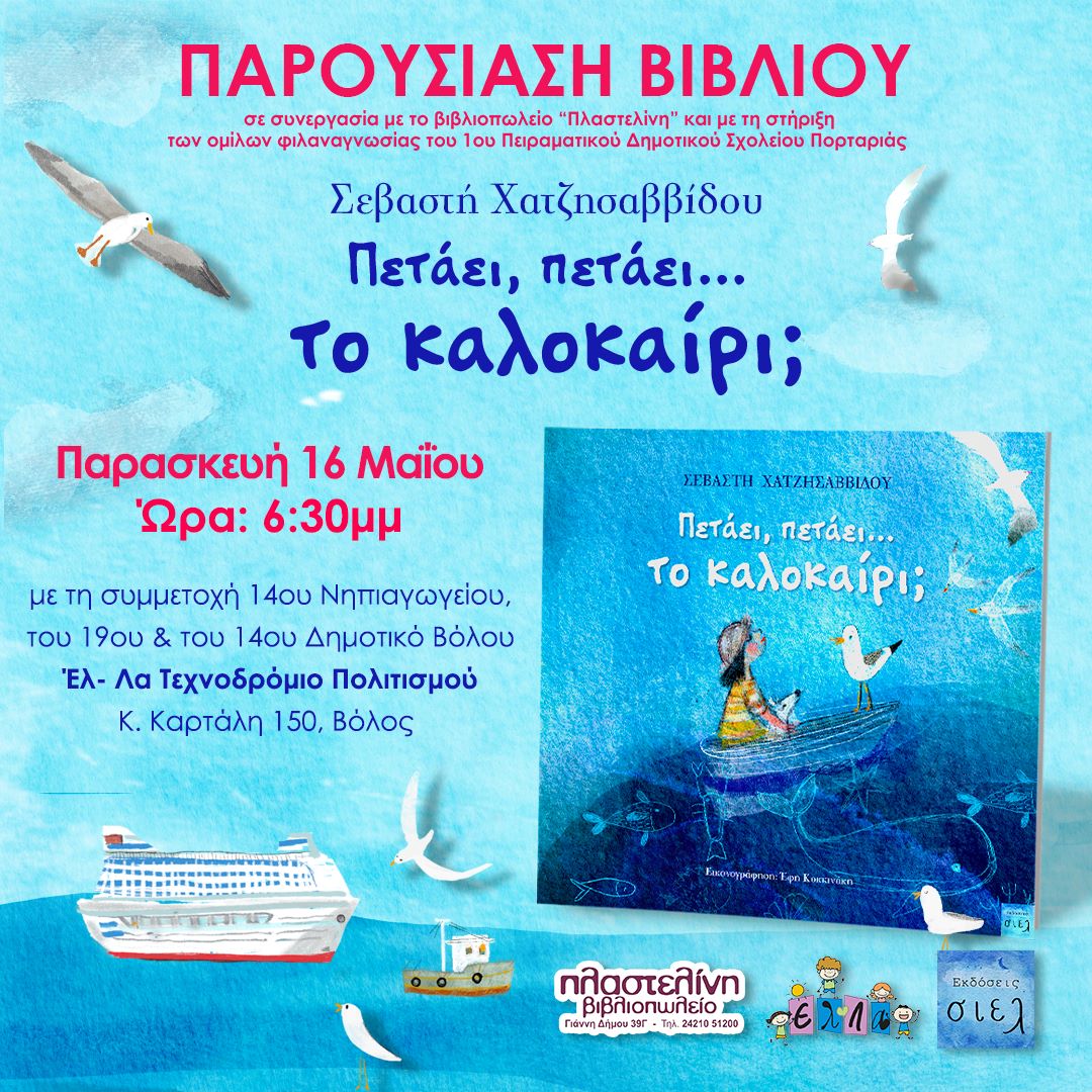 Το βιβλιοπωλείο Πλαστελίνη και οι Εκδ. ΣΙΕΛ, και με τη στήριξη των Ομίλων Φιλαναγνωσίας του 1ου Πειραματικού Δημοτικού Σχολείου Πορταριάς, θα πραγματοποιήσουν την Παρασκευή 16 Μαΐου στις 6:30 μ.μ. στην παρουσίαση βιβλίου «Πετάει, Πετάει το Καλοκαίρι», της Σεβαστής Χατζησαββίδου, στο ‘Ελ-Λα Τεχνοδρόμιο Πολιτισμού (Κ. Καρτάλη 150).