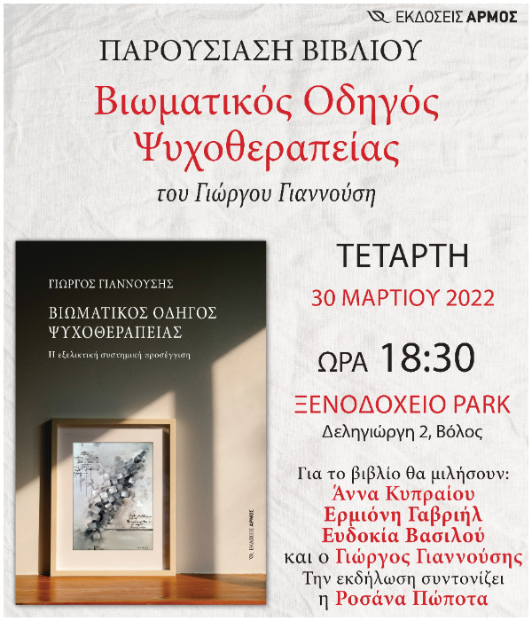 Το βιβλιοπωλείο Πλαστελίνη και οι Εκδόσεις Αρμός μας προσκαλούν στην παρουσίαση του βιβλίου του Γιώργου Γιαννούση «Βιωματικός Οδηγός Ψυχοθεραπείας Η εξελικτική συστημική προσέγγιση» την Τετάρτη 30 Mαρτίου 2022 και ώρα 18:30 στο ξενοδοχείο Park, Δεληγιώργη 2 στον Βόλο. Μέσω ανακοίνωσης αναφέρεται ότι για το βιβλίο θα μιλήσουν η Άννα Κυπραίου, Σύμβουλος ψυχικής υγείας, Εκ. στη Συστημική-Οικογενειακή θεραπεία, η Ερμιόνη Γαβριήλ, Σύμβουλος ψυχικής υγείας, Εκ. στη Συστημική-Οικογενειακή θεραπεία, η Ευδοκία Βασιλού, Συμβουλευτική Ψυχολόγος, Εκ. στη Συστημική-Οικογενειακή θεραπεία και ο συγγραφέας του βιβλίου Γιώργος Γιαννούσης. Την εκδήλωση συντονίζει η Ροσάνα Πώποτα, δημοσιογράφος.