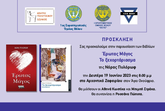 Τα βιβλία της , το μυθιστόρημα «Έρωτας Κλέφτης» (εκδόσεις Ελληνικά Γράμματα) και τα διηγήματα «Το ξεχορτάριασμα» (εκδόσεις Εντευκτήριο) θα παρουσιάσει στον Βόλο η συγγραφέας Νόρα Πυλόρωφ τη Δευτέρα 19 Ιουνίου 2023 στις 8 το βράδυ στο Αρχοντικό Ζαφειρίου στον Άγιο Ονούφριο. Στην εκδήλωση, που πραγματοποιείται με τη διοργάνωση του Κέντρου Πολιτισμού «Ιωλκός», του 1ου Σοροπτιμιστικού Ομίλου Βόλου, του Σοροπτιμιστικού Ομίλου Βόλου «Θέτις» και της ΧΕΝ Βόλου , για τα βιβλία θα μιλήσουν η Αθηνά Κωστίκα και η Μπιμπή Στράκα, θα συντονίσει η Ροσσάνα Πώποτα.