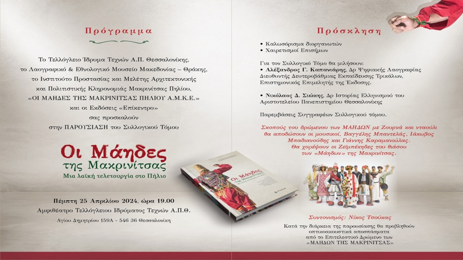 Μεγάλη αποδοχή έχει η νέα σημαντική επιστημονική έκδοση (συλλογικός τόμος) με τίτλο «Οι Μάηδες της Μακρινίτσας, Μια λαϊκή τελετουργία στο Πήλιο», που κυκλοφόρησε από τις εκδόσεις «Επίκεντρο» στο τέλος του περασμένου χρόνου καθώς θα παρουσιαστεί στη Θεσσαλονίκη, την Πέμπτη 25 Απριλίου 2024 και ώρα 19.00, στο Αμφιθέατρο του Τελλόγλειου Ιδρύματος Τεχνών Α.Π.Θ.