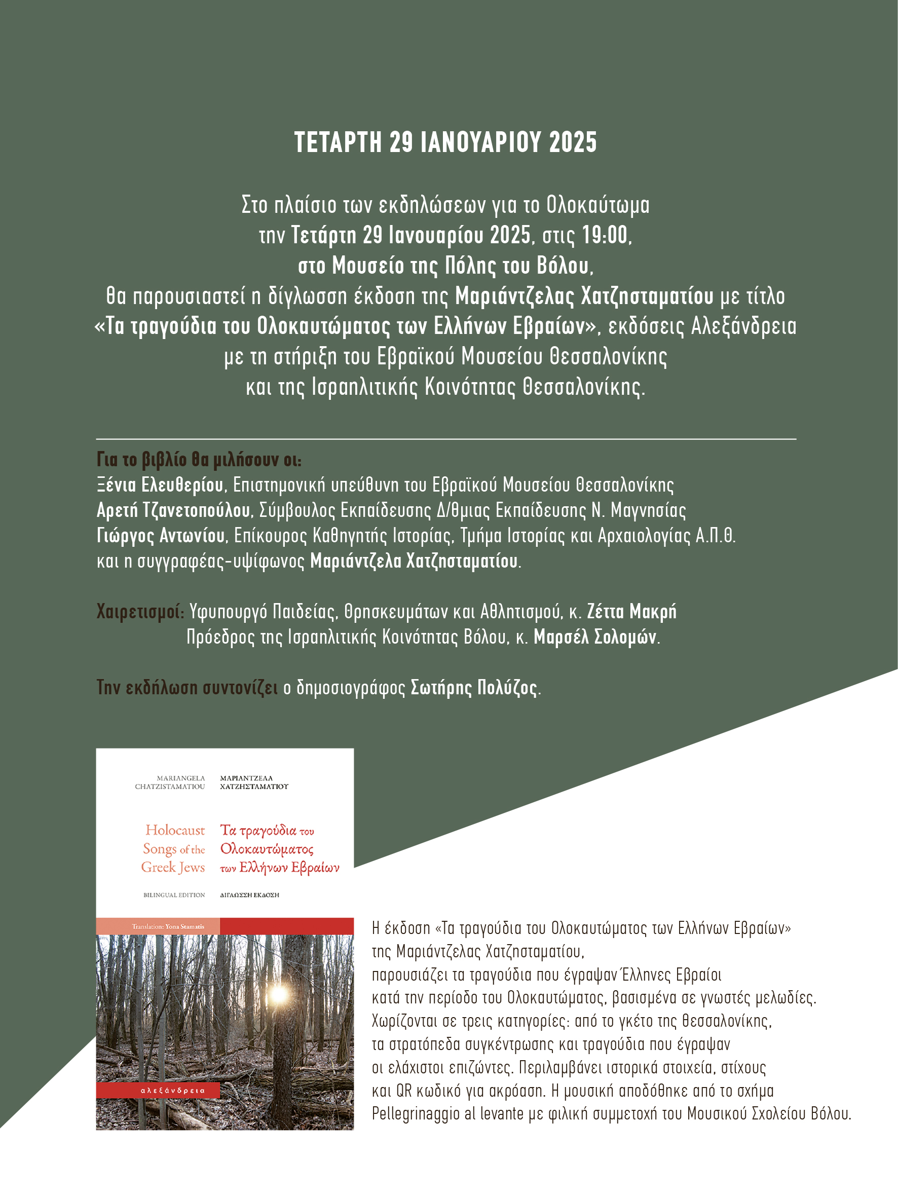 Το βιβλίο θα παρουσιαστεί στο πλαίσιο των εκδηλώσεων για το Ολοκαύτωμα, που διοργανώνονται από την Περιφέρεια Θεσσαλίας-Περιφερειακές Ενότητες Μαγνησίας & Σποράδων, τον Δήμο Βόλου και την Ισραηλιτική Κοινότητα Βόλου, την Τετάρτη 29 Ιανουαρίου 2025, στις 19.00, στο Μουσείο της Πόλης του Βόλου, με τη στήριξη του Εβραϊκού Μουσείου Θεσσαλονίκης και της Ισραηλιτικής Κοινότητας Θεσσαλονίκης.