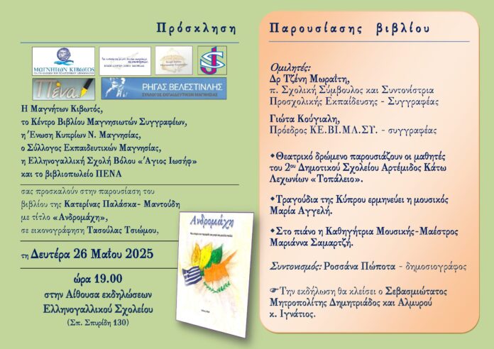 Την εκδήλωση στηρίζουν οι φορείς: Η Μαγνήτων Κιβωτός, Το Κέντρο Μαγνησιωτών Συγγραφέων Μαγνησίας (ΚΕ.ΒΙ.ΜΑ.ΣΥ), Η Ένωση Κυπρίων Ν. Μαγνησίας, Ο Σύλλογος Εκπαιδευτικών Ν. Μαγνησίας, Η Ελληνογαλλική Σχολή Βόλου «Άγιος Ιωσήφ» και το βιβλιοπωλείο «ΠΕΝΑ».