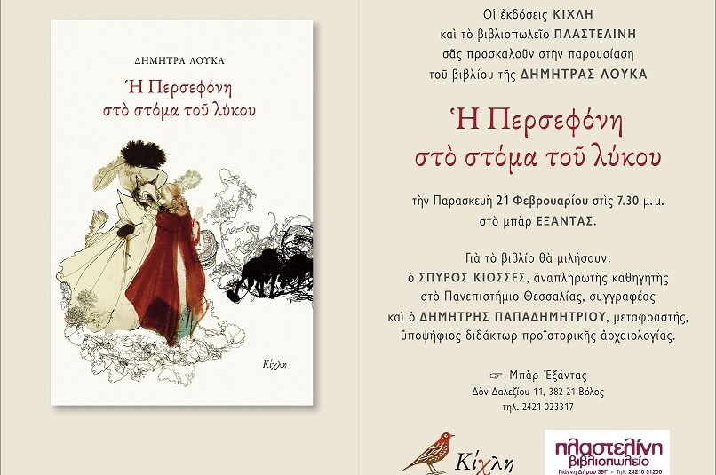 Οι εκδόσεις ΚΙΧΛΗ και το βιβλιοπωλείο Πλαστελίνη, πραγματοποιούν την παρουσίαση του βιβλίου της Δήμητρας Λουκά «Η Περσεφόνη στο στόμα του λύκου» την Παρασκευή 21 Φεβρουαρίου στις 7:30μ.μ. στο μπαρ «Εξάντας» (Δον Δαλεζίου 11) στον Βόλο.