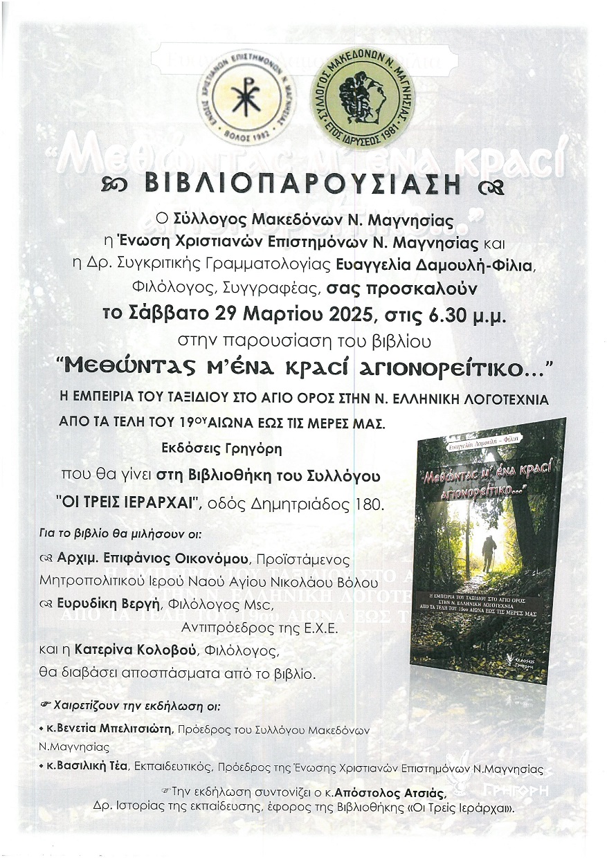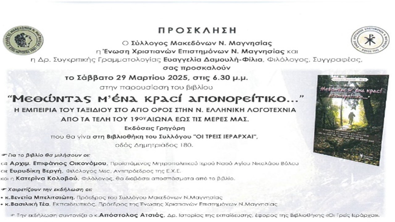 Ο Σύλλογος Μακεδόνων Ν. Μαγνησίας, η Ένωση Χριστιανών Επιστημόνων Ν. Μαγνησίας και η Δρ. Συγκριτικής Γραμματολογίας Ευαγγελία Δαμουλή- Φίλια, φιλόλογος και συγγραφέας πραγματοποιούν το Σάββατο 29 Μαρτίου στις 6:30μ.μ. παρουσίαση του βιβλίου « «Μεθώντας μ’ ένα κρασί αγιονορείτικο…»- Η εμπειρία του ταξιδιού στο Άγιο Όρος στην Ν. Ελληνική Λογοτεχνία, από τα τέλη του 19ου αιώνα έως τις μέρες μας», που κυκλοφορεί από τις Εκδόσεις Γρηγόρη στη Βιβλιοθήκη του Συλλόγου «Οι Τρεις Ιεράρχαι» στην οδό Δημητριάδος 180.