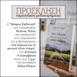 Η «Κόσμος Εκδοτική» παρουσιάζει στον Βόλο το μυθιστόρημα του συγγραφέα Κώστα Τόλη με τίτλο «στη Λάρισα και οι φτωχοί είναι σνομπ» τη Δευτέρα 9 Δεκεμβρίου στις 7 το απόγευμα στο ξενοδοχείο Volos Palace.