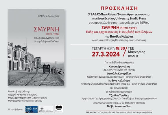 Την Τέταρτη 27 Μαρτίου και ώρα 18.30 θα γίνει στο ΤΕΕ Μαγνησίας ανοικτή εκδήλωση για την παρουσίαση του βιβλίου «ΣΜΥΡΝΗ [1870-1922] Πόλη και αρχιτεκτονική. Η συμβολή των Ελλήνων», του Βασίλη Κολώνα, ομότιμου Καθηγητή Αρχιτεκτονικής του Πανεπιστημίου Θεσσαλίας.