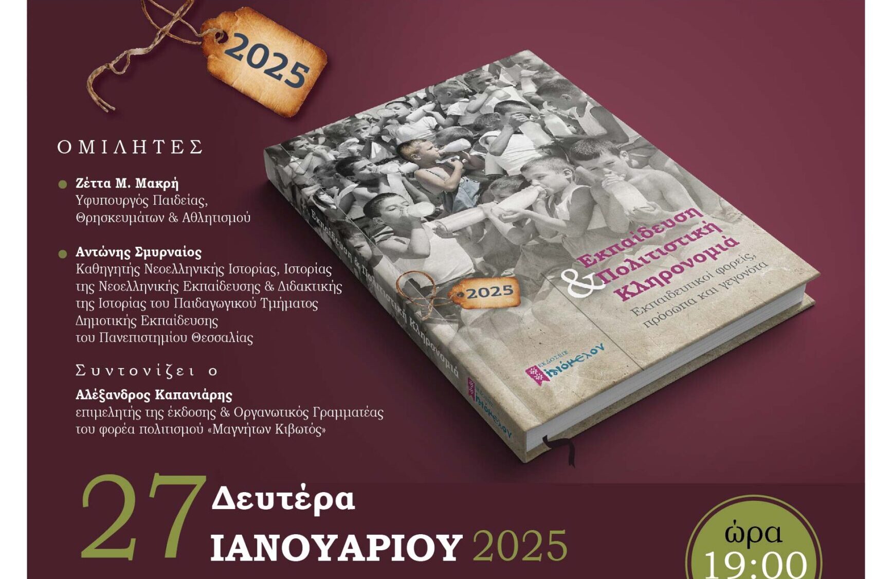 Ομιλητές θα είναι η Υφυπουργός Παιδείας, Θρησκευμάτων και Αθλητισμού Ζέττα Μακρή και ο Καθηγητής Νεοελληνικής Ιστορίας του Παιδαγωγικού Τμήματος Δημοτικής Εκπαίδευσης του Πανεπιστημίου Θεσσαλίας Αντώνης Σμυρναίος. Θα συντονίσει ο Αλέξανδρος Καπανιάρης, επιμελητής της έκδοσης και οργανωτικός γραμματέας του φορέα πολιτισμού «Μαγνήτων Κιβωτός».