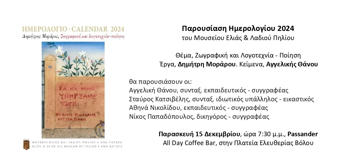 Την Παρασκευή 15 Δεκεμβρίου ώρα 7:30 μ.μ., στο Passander, All Day Coffee Bar, στην Πλατεία Ελευθερίας Βόλου, θα γίνει η παρουσίαση του Ημερολογίου 2024, του Μουσείου Ελιάς και Λαδιού Πηλίου. Θα απαγγείλουν οι: Αγγελική Θάνου, συνταξ. εκπαιδευτικός – συγγραφέας, Σταύρος Κατσιβέλης, συνταξ. ιδιωτικός υπάλληλος – εικαστικός, Αθηνά Νικολίδου, εκπαιδευτικός – συγγραφέας, Νίκος Παπαδόπουλος, δικηγόρος – συγγραφέας.