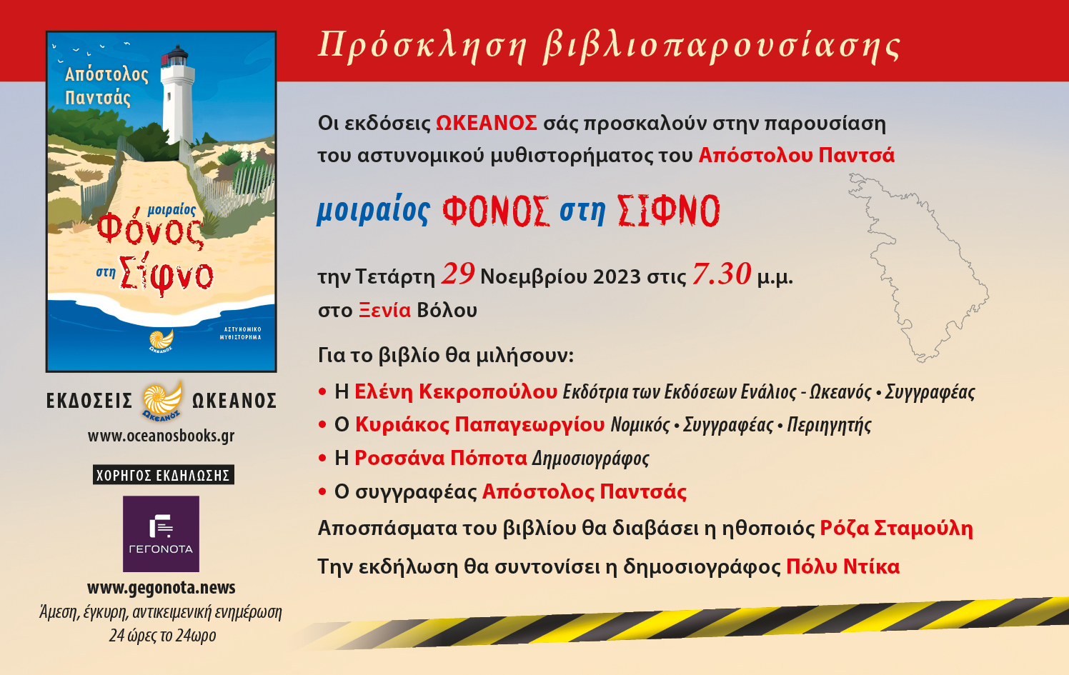Το νέο βιβλίο του Απόστολου Παντσά με τίτλο «Μοιραίος φόνος στη Σίφνο» θα παρουσιαστεί στο Βόλο την Τετάρτη 29 Νοεμβρίου 2023, 7.30 το απόγευμα στο ξενοδοχείο «Ξενία» με τη διοργάνωση των εκδόσεων «Ωκεανός». Για το βιβλίο θα μιλήσουν : Ελένη Κεκροπούλου – εκδότρια των εκδόσεων «Ωεκανός» και «Ενάλιος» – συγγραφέας, Κυριάκος Παπαγεωργίου – νομικός – συγγραφέας – περιηγητής, Ροσσάνα Πώποτα – δημοσιογράφος και ο Απόστολος Παντσάς. Αποσπάσματα του βιβλίου θα διαβάσει η ηθοποιός Ρόζα Σταμούλα. Την εκδήλωση θα συντονίσει η δημοσιογράφος Πόλυ Ντίκα.