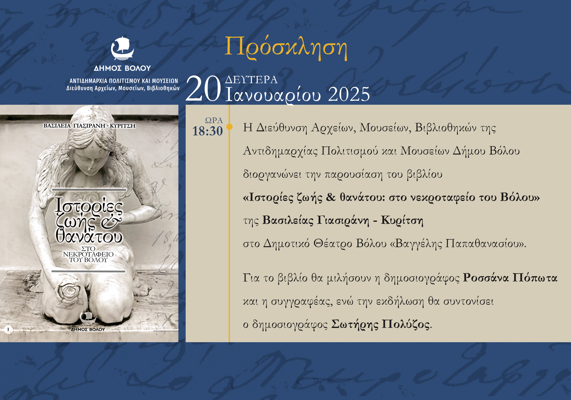 Η Διεύθυνση Αρχείων, Μουσείων, Βιβλιοθηκών της Αντιδημαρχίας Πολιτισμού και Μουσείων Δήμου Βόλου διοργανώνει την παρουσίαση του βιβλίου «Ιστορίες ζωής & θανάτου: στο νεκροταφείο του Βόλου» της Βασιλείας Γιασιράνη- Κυρίτση στο Δημοτικό Θέατρο Βόλου «Βαγγέλης Παπαθανασίου».