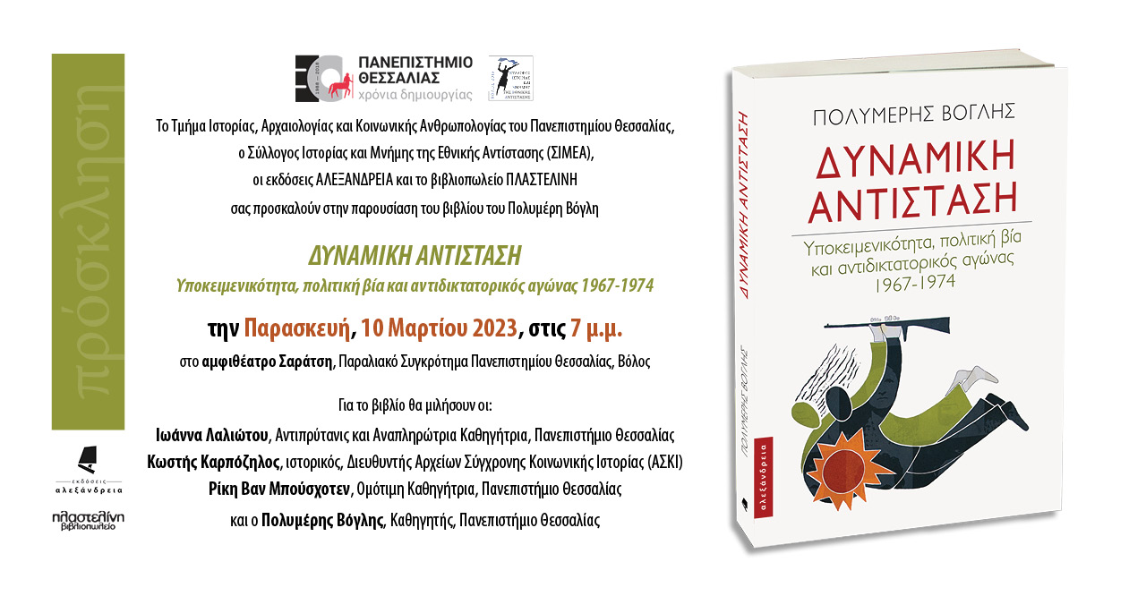Το τμήμα Ιστορίας, Αρχαιολογίας και Κοινωνικής Ανθρωπολογίας του Πανεπιστημίου Θεσσαλίας , ο Σύλλογος Ιστορίας Μνήμης Εθνικής Αντίστασης (ΣΙΜΕΑ), οι εκδόσεις «ΑΛΕΞΑΝΔΡΕΙΑ» και το βιβλιοπωλείο Πλαστελίνη, παρουσιάζουν το βιβλίο του καθηγητή ιστορίας στο Πανεπιστήμιο Θεσσαλίας Πολυμέρη Βόγλη, με τίτλο «Δυναμική Αντίσταση», την Παρασκευή 10 Μαρτίου στις 7 το απόγευμα στο αμφιθέατρο Σαράτση του παραλιακού συγκροτήματος Παπαστράτος του Πανεπιστημίου Θεσσαλίας στον Βόλο.