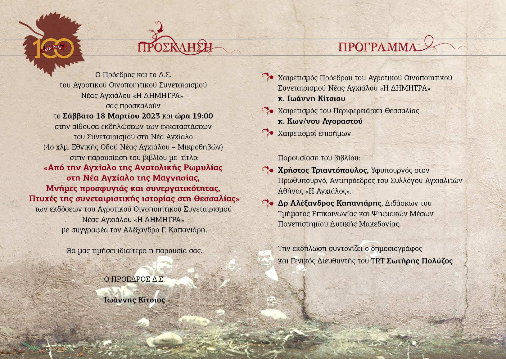 Ο Πρόεδρος και το Δ.Σ. του Αγροτικού Οινοποιητικού Συνεταιρισμού Νέας Αγχιάλου – «Η ΔΗΜΗΤΡΑ» προσκαλούν το Σάββατο 18 Μαρτίου 2023 και ώρα 19:00 στην αίθουσα εκδηλώσεων των εγκαταστάσεων του Συνεταιρισμού στη Νέα Αγχίαλο (4ο χλμ. Εθνικής Οδού Νέας Αγχιάλου – Μικροθηβών) στην παρουσίαση του βιβλίου με τίτλο: «Από την Αγχίαλο της Ανατολικής Ρωμυλίας στην Νέα Αγχίαλο της Μαγνησίας, Μνήμες προσφυγιάς και συνεργατικότητας, Πτυχές της συνεταιριστικής ιστορίας στη Θεσσαλία» των εκδόσεων του Αγροτικού Οινοποιητικού Συνεταιρισμού Νέας Αγχιάλου «Η ΔΗΜΗΤΡΑ» με συγγραφέα τον Αλέξανδρο Γ. Καπανιάρη.