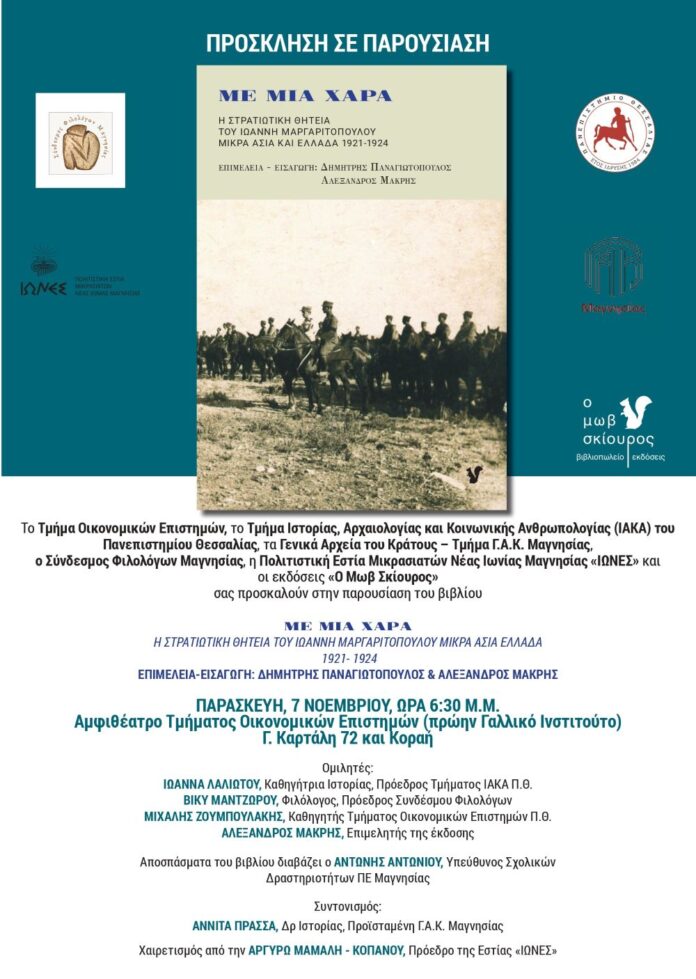 Παρουσιάζεται σήμερα Παρασκευή 7 Νοεμβρίου στις 6.30 στο αμφιθέατρο του Τμήματος Οικονομικών Επιστημών (πρώην Γαλλικό Ινστιτούτο), Γ. Καρτάλη 72 και Κοραή, το βιβλίο «Με μια χαρά. Η στρατιωτική θητεία του Ιωάννη Μαργαριτόπουλου. Μικρά Ασία και Ελλάδα 1921-1924» σε επιμέλεια και εισαγωγή του Δημήτρη Παναγιωτόπουλου και Αλέξανδρου Μακρής, από τις Εκδόσεις «Ο Μωβ Σκίουρος», 2025.