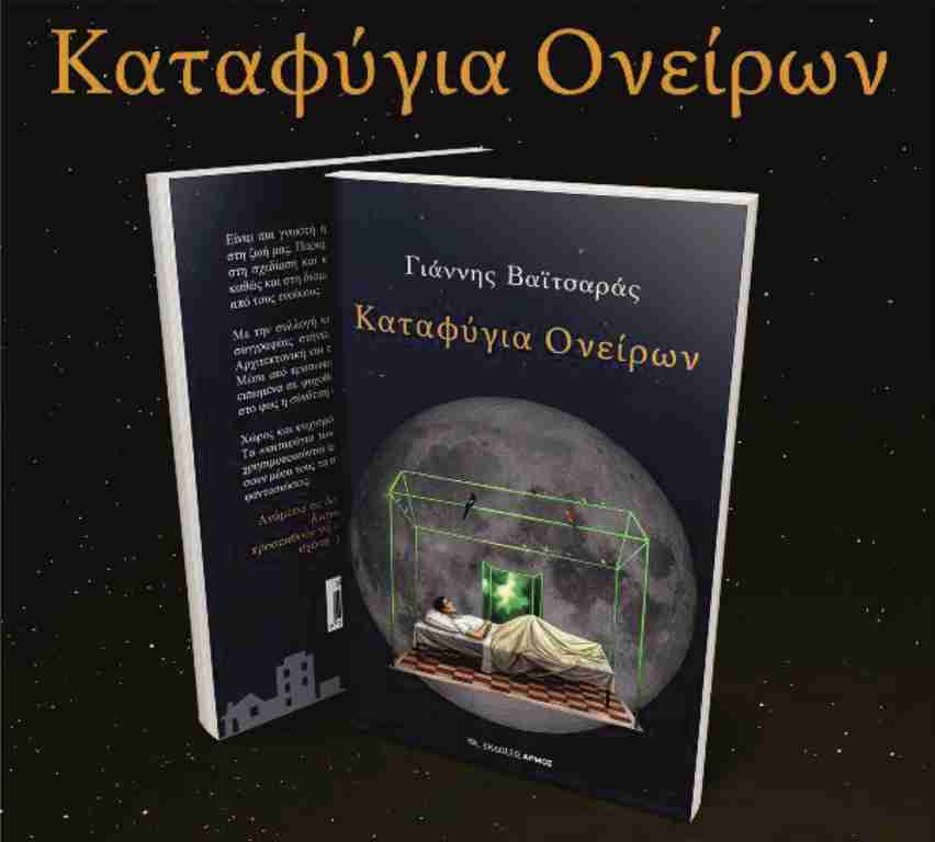 Οι Εκδόσεις Αρμός διοργανώνουν την παρουσίαση του βιβλίου του ψυχολόγου Γιάννη Βαϊτσαρά «Καταφύγια Ονείρων» τη Δευτέρα 8 Απριλίου στις 19:00 στο βιβλιοπωλείο «ΗΛΙΟΣ» στην οδό Παύλου Μελά 25β, στον Βόλο. Ο συγγραφέας θα μιλήσει για τη σχέση ψυχανάλυσης και αρχιτεκτονικής. Διαβάζουν οι ηθοποιοί: Βασίλης Μητσάκης και Αμαλία Γκιζά. Θα προβληθούν βίντεο εμπνευσμένα από αποσπάσματα του βιβλίου.
