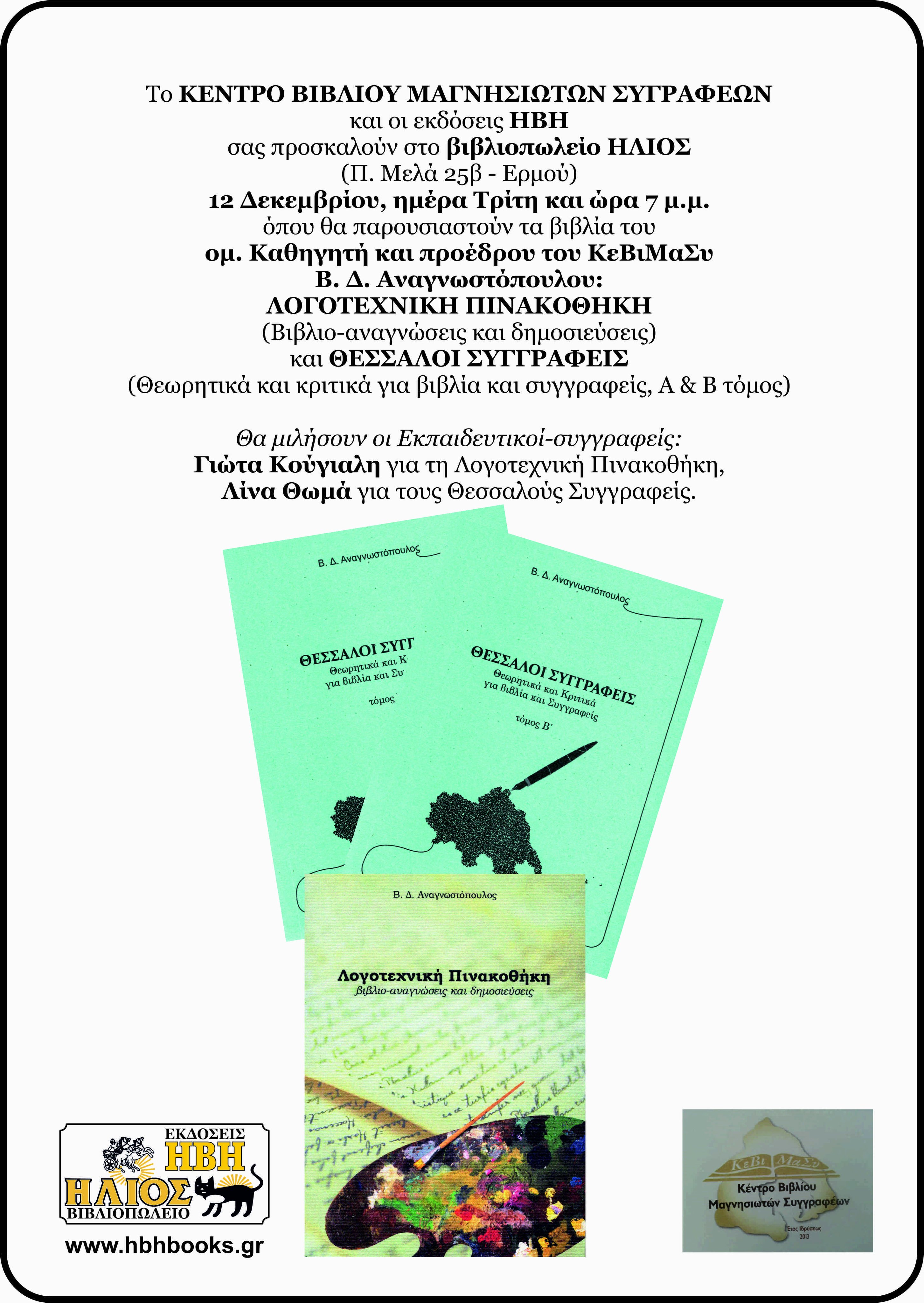 Το Κέντρο Βιβλίου Μαγνησιωτών συγγραφέων και οι Εκδόσεις ΗΒΗ διοργανώνουν εκδήλωση όπου θα παρουσιαστούν τα βιβλία του ομ. Καθηγητή και προέδρου του Κεβιμασύ Β. Δ. Αναγνωστόπουλου: «Λογοτεχνική Πινακοθήκη (Βιβλιο-αναγνώσεις και δημοσιεύσεις) και Θεσσαλοί Συγγραφείς, τόμοι Α & Β, (Θεωρητικά και κριτικά για βιβλία και συγγραφείς) στο πατάρι του Βιβλιοπωλείου ΗΛΙΟΣ (Παύλου Μελά 25β – Ερμού) την Τρίτη 12 Δεκεμβρίου και ώρα 7 μ.μ.. Θα μιλήσουν οι Εκπαιδευτικοί-συγγραφείς: Γιώτα Κούγιαλη για τη Λογοτεχνική Πινακοθήκη, Λίνα Θωμά για τους Θεσσαλούς Συγγραφείς. Την εκδήλωση θα συντονίζει ο εκδότης Χρήστος Αγιώτης.