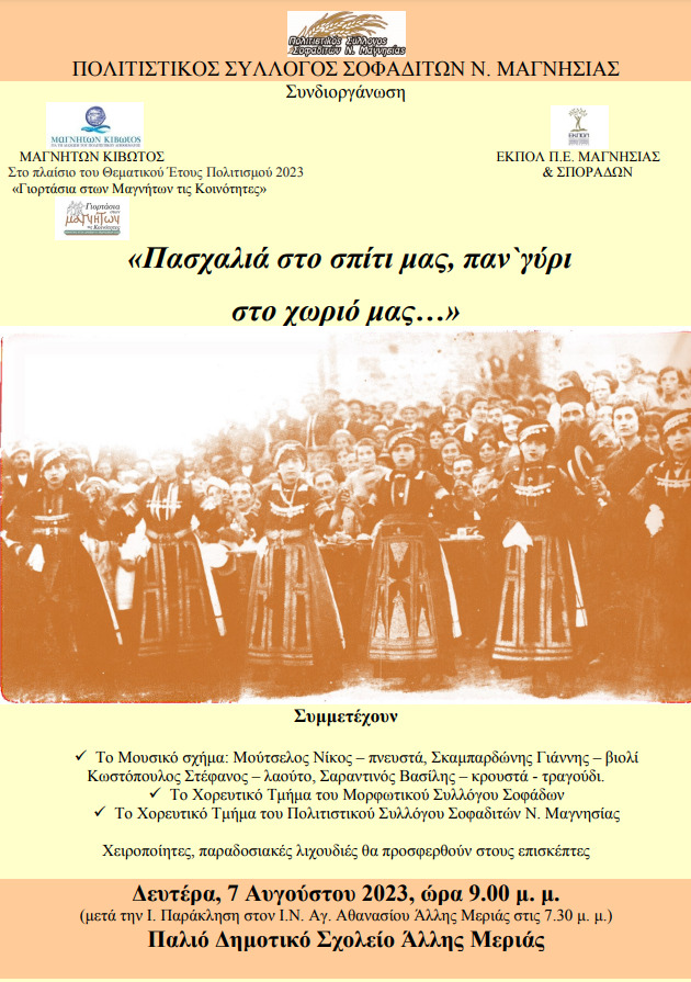 Ο Πολ/κός Σύλλογος Σοφαδιτών Ν. Μαγνησίας συνδιοργανώνει από κοινού με τη Μαγνήτων Κιβωτό (στα πλαίσια του Θεματικού Έτους “Γιορτάσια στων Μαγνήτων τις Κοινότητες” & τις Αυγουστιάτικες Παρακλήσεις και με την ΕΚΠΟΛ Π.Ε. Μαγνησίας & Σποράδων εκδήλωση με τίτλο «Πασχαλιά στο σπίτι μας , παν`γύρι στο χωριό μας…» και καλεί τα μέλη και τους φίλους του τη Δευτέρα, 7 Αυγούστου του 2023 και ώρα 9.00 μ. μ. στην αυλή του Παλιού Δημοτικού Σχολείου Άλλης Μεριάς. Είναι ένα αφιέρωμα στην ομαδική χαρά, πλαισιωμένο από το μουσικό σχήμα του Νίκου Μούτσελου και τα χορευτικά του Μορφωτικού Συλλόγου Σοφάδων και του Συλλόγου Σοφαδιτών Μαγνησίας. Στην εκδήλωση –με ελεύθερη είσοδο για το κοινό- θα προσφερθούν χειροποίητες παραδοσιακές λιχουδιές