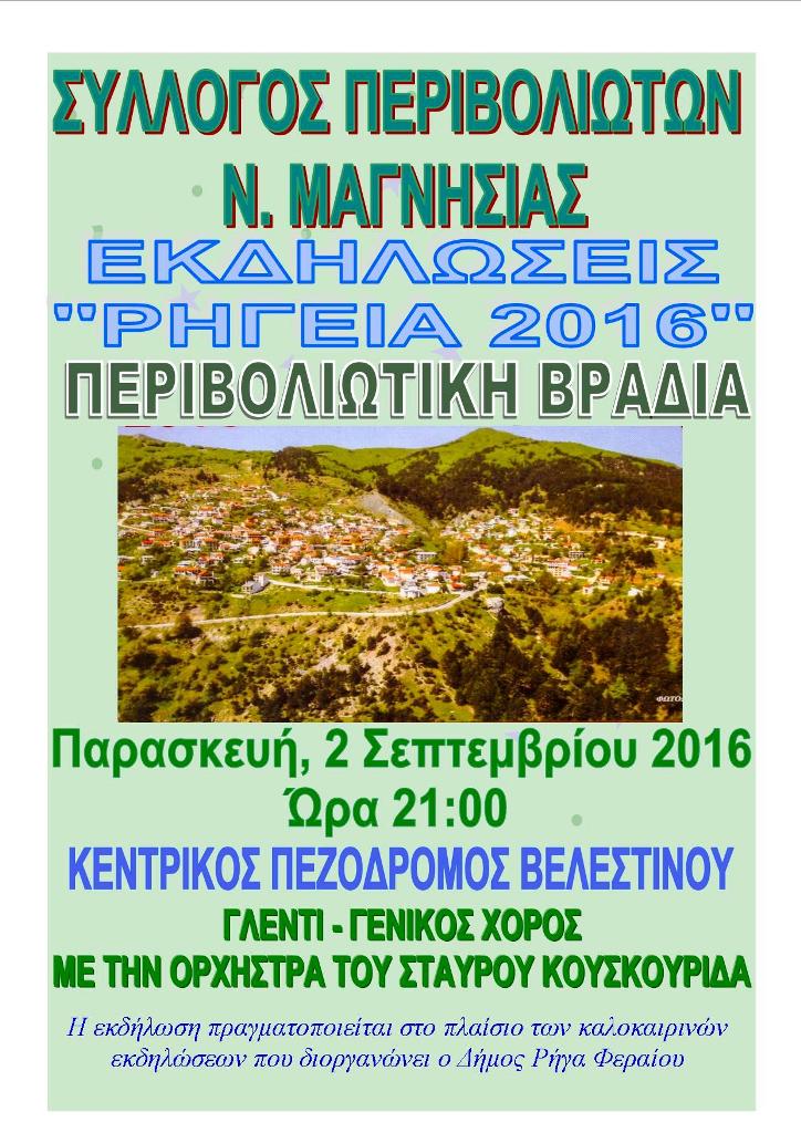 O Σύλλογος Περιβολιωτών Ν. Μαγνησίας, στο πλαίσιο των καλοκαιρινών πολιτιστικών εκδηλώσεων με την ονομασία «ΡΗΓΕΙΑ 2016» που διοργανώνονται από τον Δήμο Ρήγα Φεραίου, θα πραγματοποιήσει την Παρασκευή, 2 Σεπτεμβρίου 2016, ώρα 21:00 στον κεντρικό πεζόδρομο του Βελεστίνου, μεγάλη μουσικοχορευτική εκδήλωση ‘’Περιβολιώτικη βραδιά’’, με είσοδο ελεύθερη, όπου θα εμφανισθούν τα χορευτικά τμήματα ενηλίκων του Συλλόγου.
