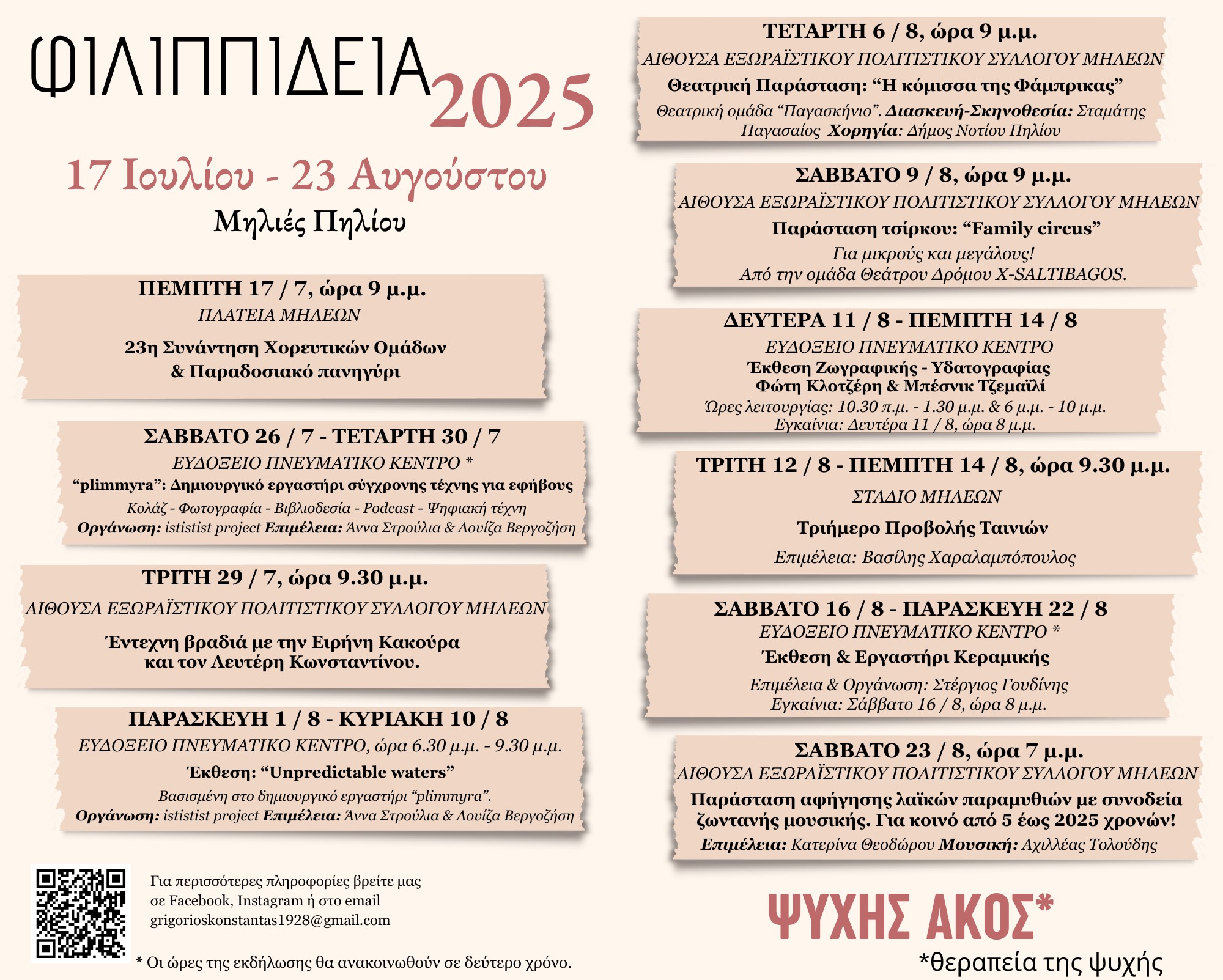 Πλήθος εκδηλώσεων θα πραγματοποιηθούν και φέτος στα «Φιλιππίδεια», που διοργανώνει ο Εξωραϊστικός και Πολιτιστικός Σύλλογος Μηλεών Πηλίου «Γρηγόριος Κωνσταντάς» από τις 17 Ιουλίου έως τις 23 Αυγούστου στις Μηλιές.