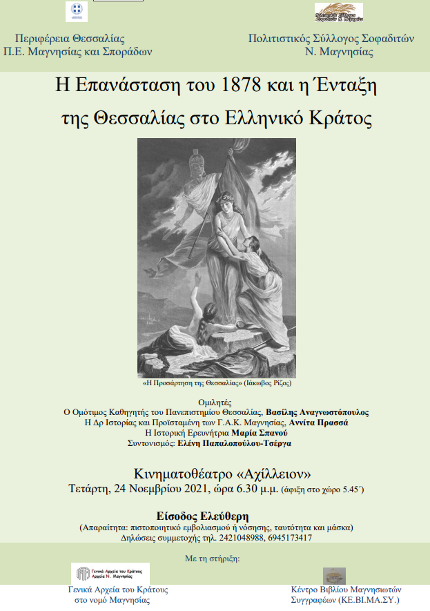 Επίσης, στα πλαίσια αυτής της Έκθεσης και συμμετέχοντας στον εθνικό εορτασμό για τα 200 χρόνια από την Εθνική Παλιγγενεσία, ο Σύλλογος Σοφαδιτών Μαγνησίας θα παρουσιάσει την Τετάρτη, 24 Νοεμβρίου, στις 6.30 μ. μ., στο κινηματοθέατρο «Αχίλλειον» εκδήλωση λόγου με τίτλο «Η Επανάσταση του 1878 και η Ένταξη της Θεσσαλίας στο Ελληνικό Κράτος», που συνδιοργανώνει με την Περιφέρεια Θεσσαλίας – Π. Ε. Μαγνησίας και Σποράδων, με τη στήριξη των Γενικών Αρχείων του Κράτους (Γ.Α.Κ.) Ν.Μαγνησίας και του Κέντρου Βιβλίου Μαγνησιωτών Συγγραφέων (ΚΕ.ΒΙ.ΜΑ.ΣΥ.). Οι εισηγητές, ο ομότιμος καθηγητής του Πανεπιστημίου Θεσσαλίας και πρόεδρος του ΚΕ.ΒΙ.ΜΑ.ΣΥ Βασίλης Αναγνωστόπουλος, η δρ. ιστορίας και προϊσταμένη των Γ.Α.Κ. Μαγνησίας Αννίτα Πρασσά και η ιστορική ερευνήτρια Μαρία Σπανού θα παρουσιάσουν το ιστορικό πλαίσιο της Επανάστασης του 1878, εστιάζοντας κυρίως στα γεγονότα που συνέβησαν εκείνη την ταραγμένη εποχή στις περιοχές του Πηλίου (μάχη της Μακρινίτσας) και της Καρδίτσας (μάχη της Ματαράγκας Σοφάδων). Οι ηθοποιοί Βασίλης Μητσάκης και η Αμαλία Γκιζά θα ζωντανέψουν με το λόγο τους σκηνές της εποχής μέσα από αποσπάσματα λογοτεχνικών κειμένων των Ζήση Σκάρου, Δημήτρη Σουλτάτη και Χριστόφορου Σεμέργελη, ενώ η φωνή της Σοφαδίτισσας Τασούλας Παπάρα-Κοσκινιώτη θα αποδώσει τοπικό μοιρολόι για τον ήρωα λοχία Λάιο, που σκοτώθηκε στη μάχη Ματαράγκας Σοφάδων. Συντονίζει η πρόεδρος του Συλλόγου, Ελένη Παπαλοπούλου-Τσέργα.