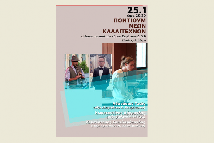 Ένας νέος κύκλος συναυλιών εγκαινιάζεται στον “ΧΕΙΜΩΝΑΝΘΟ” ΙΙΙ. Έχει τον τίτλο «Πόντιουμ νέων καλλιτεχνών» και απόψε Τετάρτη 25/1/2017, στις 20:30 στην αίθουσα συναυλιών Έρση Σαράτση του Δ.Ω.Β. το “ΠΟΝΤΙΟΥΜ” είναι αφιερωμένο σε τρεις τελειόφοιτους σπουδαστές του Δ.Ω.Β.