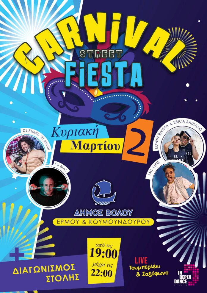 Ο Δήμος Βόλου σε συνεργασία με την σχολή χορού Independance Studio στο Βόλο, θα εκτινάξουν στα ύψη τη διάθεση των καρναβαλιστών με latin και mainstream μουσικές, happenings, ομαδικά παιχνίδια, διαγωνισμό αποκριάτικης στολής, standupcomedy, χορό και πολλά άλλα δρώμενα!