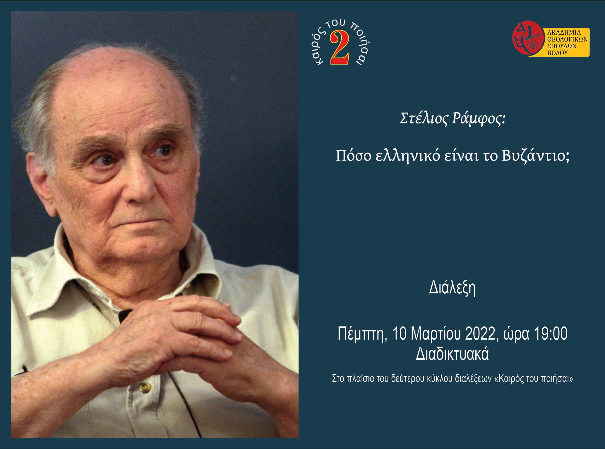 Η τέταρτη εκδήλωση του φετινού κύκλου «Καιρός του ποιήσαι» της Ακαδημίας Θεολογικών Σπουδών Βόλου θα πραγματοποιηθεί την Πέμπτη, 10 Μαρτίου 2022, στις 7:00 μ.μ. με ομιλητή τον συγγραφέα Στέλιο Ράμφο, που θα παρουσιάσει το θέμα «Πόσο ελληνικό είναι το Βυζάντιο;». Η διάλεξη θα είναι διαδικτυακή, προσβάσιμη μέσω της πλατφόρμας Zoom και θα δοθεί στα ελληνικά.