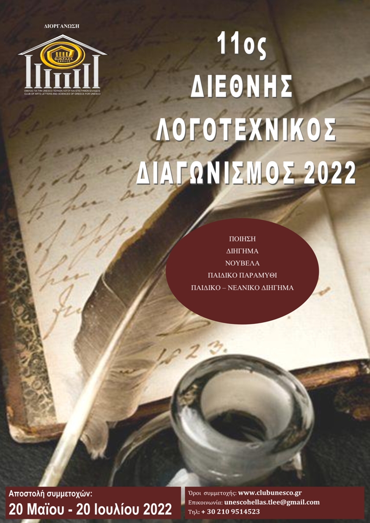 Ο Όμιλος για την UNESCO Τεχνών, Λόγου και Επιστημών Ελλάδος προκηρύσσει τον 11ο Διεθνή Λογοτεχνικό Διαγωνισμό 2022, με λήξη την 20η Ιουλίου. Ο διαγωνισμός περιλαμβάνει τα είδη του λόγου: Διήγημα, Νουβέλα, Ποίηση, Παιδικό παραμύθι, Παιδικό – νεανικό διήγημα.