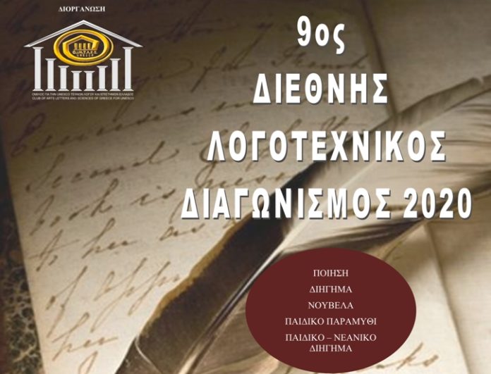 Ο Όμιλος για την UNESCO Τεχνών, Λόγου και Επιστημών Ελλάδος προκηρύσσει τον 9ο Διεθνή Λογοτεχνικό Διαγωνισμό 2020, με λήξη την 20η Ιουλίου 2020. Ο διαγωνισμός για το τρέχον έτος, περιλαμβάνει τα εξής είδη του λόγου: Διήγημα, Νουβέλα, Ποίηση, Παιδικό παραμύθι, Παιδικό – νεανικό διήγημα. Η κρίση των έργων θα γίνει από κριτική επιτροπή που ορίζεται από το Δ.Σ. του Ομίλου και αποτελείται από διακεκριμένους λογοτέχνες και συγγραφείς. Για λόγους διασφάλισης της αντικειμενικότητας του διαγωνισμού, τα μέλη της επιτροπής θα ανακοινωθούν, μετά την έκδοση των αποτελεσμάτων. Τα αποτελέσματα του διαγωνισμού θα ανακοινωθούν στην ιστοσελίδα και την εφημερίδα του Ομίλου, καθώς και στις σελίδες του στο facebook, μετά την τελετή απονομής των βραβείων, που θα πραγματοποιηθεί στην Αθήνα, τον Νοέμβριο του 2020 και στην οποία θα αποδοθούν τα βραβεία στους διακριθέντες και τ’ αναμνηστικά διπλώματα στους λοιπούς συμμετέχοντες.