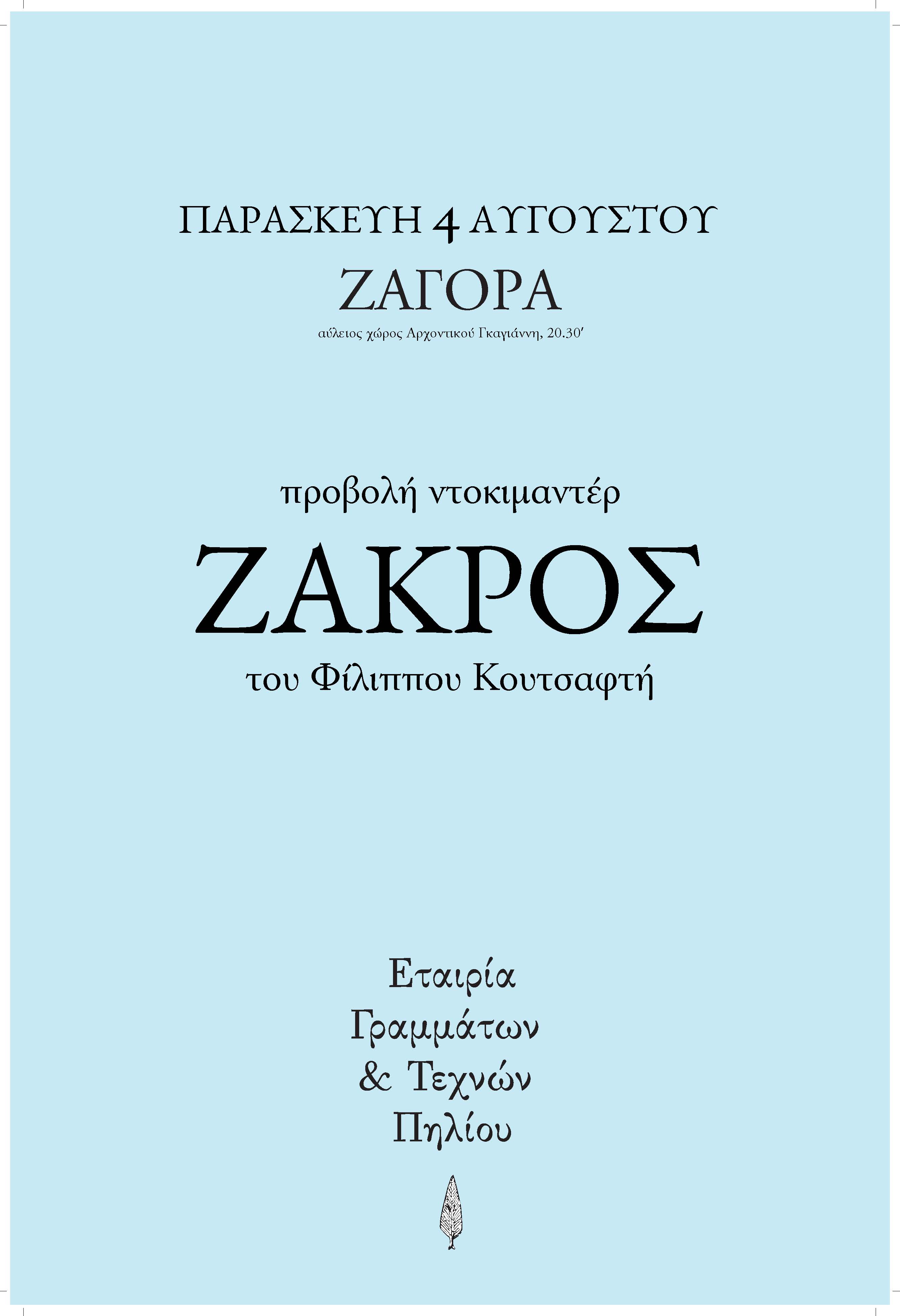 Η Εταιρία Γραμμάτων και Τεχνών Πηλίου θα προβάλει την Παρασκευή, 4 Αυγούστου 2023 και ώρα 20.30΄ στον αύλειο χώρο του Αρχοντικού Κωνσταντινίδη (Γκαγιάννη) στη Ζαγορά, την τελευταία ταινία – ντοκιμαντέρ του Φίλιππου Κουτσαφτή, με τίτλο “ΖΑΚΡΟΣ”. Η προβολή γίνεται για πρώτη φορά δημόσια (μετά το φεστιβάλ της Θεσσαλονίκης).