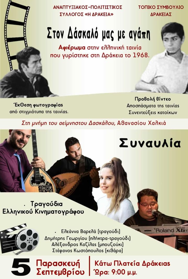 Η Δράκεια αποχαιρετά το καλοκαίρι με μια εκδήλωση που έχει θέμα την ταινία «Στον δάσκαλο μας με αγάπη» που είχε γυριστεί στο χωριό το 1968 με την συμμετοχή του Άγγελου Αντωνόπουλου, Βασίλη Καΐλα, Νίκη Τριανταφυλλίδη και άλλους γνωστούς ηθοποιούς. H εκδήλωση θα πραγματοποιηθεί την Παρασκευή 5 Σεπτεμβρίου στις 9 το βράδυ στην κάτω πλατεία της Δράκειας.