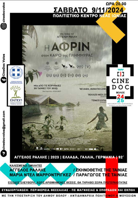 Στο πλαίσιο της επετείου ενός έτους από τις καταστροφικές πλημμύρες στη Θεσσαλία, το φεστιβάλ ντοκιμαντέρ CineDoc Βόλου, παρουσιάζει το Σάββατο 9 Νοεμβρίου στις 8 το βράδυ στο Πολιτιστικό Κέντρο Νέας Ιωνίας, το πολυβραβευμένο κλιματικό ντοκιμαντέρ «Η Αφρίν στον Καιρό της Πλημμύρας».