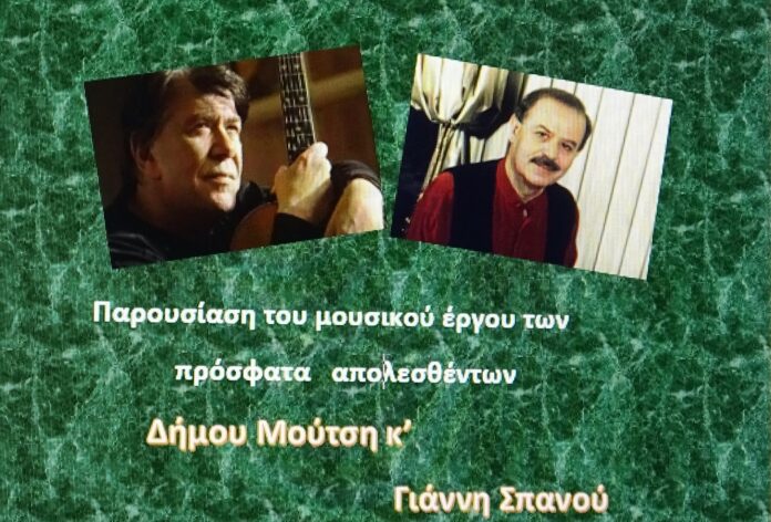 Την Πέμπτη 27 Φεβρουαρίου Κέντρο Πολιτισμού και Τεχνών «Θεατρίνη» στην οδό Πλάτωνος 20 στον Βόλο, και στις 7:30 μμ θα παρουσιαστεί βίντεο διάρκειας 65’ , με το μουσικό έργο δύο μεγάλων Ελλήνων συνθετών, που έφυγαν πρόσφατα από τη ζωή, του Δήμου Μούτση και του Γιάννη Σπανού σε επιμέλεια Γιάννη Κωστή.