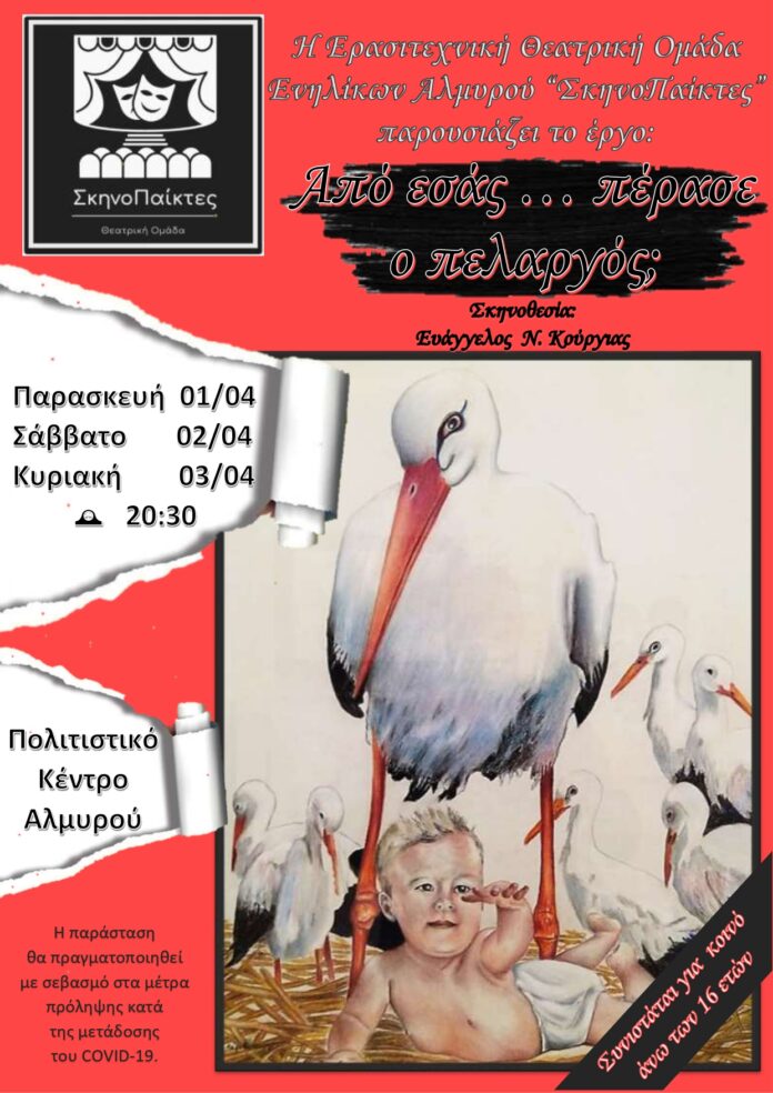 Η Ερασιτεχνική Θεατρική Ομάδα Ενηλίκων Αλμυρού ΣκηνοΠαίκτες παρουσιάζει τη θεατρική παράσταση “Από εσάς … πέρασε ο πελαργός;”, με μια σειρά παραστάσεων που θα πραγματοποιηθούν στο Πολιτιστικό Κέντρο Αλμυρού σήμερα Παρασκευή 1, το Σάββατο 2 και την Κυριακή 3 Απριλίου 2022, στις 20:30. Σύμφωνα με σχετική ανακοίνωση πρόκειται για μια διασκευή του δημοφιλέστατου έργου των Ρέππα και Παπαθανασίου “Τα μωρά τα φέρνει ο πελαργός”, που προέκυψε από αυτοσχεδιασμούς των ηθοποιών που συμμετέχουν, αλλά και από σκηνοθετικές κατευθύνσεις.