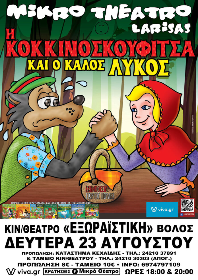 Η παράσταση “Η Κοκκινοσκουφίτσα και ο καλός λύκος” θα ανέβει στην Εξωραϊστική, στον Βόλο τη Δευτέρα 23 Αυγούστου. Θα γίνουν δύο παραστάσεις στις 6 το απόγευμα και στις 8 το βράδυ.