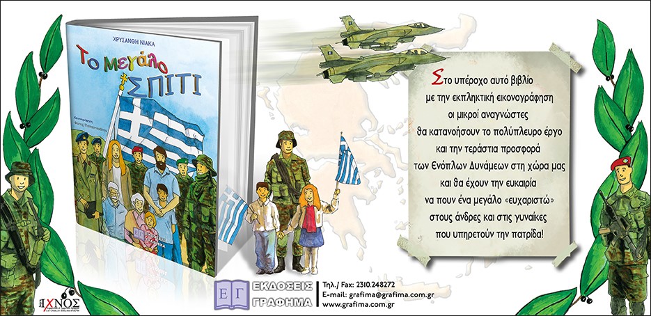 Αυτό το βιβλίο εμπνέει μικρούς και μεγάλους καθώς στις σελίδες του προβάλλονται με άριστο τρόπο, μέσα από τα μάτια ενός παιδιού, το έργο των Ενόπλων Δυνάμεων της χώρας και το αίσθημα εθνικής ασφάλειας που παρέχουν, επικεντρώνοντας παράλληλα και στην πολυεπίπεδη κοινωνική τους προσφορά”!