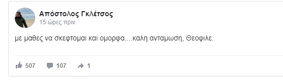 Ο Απόστολος Γκλέτσος, ο οποίος βρέθηκε δίπλα του στη δημοφιλή σειρά «Τμήμα Ηθών» -από την οποία αμφότεροι έγιναν γνωστοί- αποχαιρέτισε δημόσια τον Θεόφιλο, με μια συγκινητική ανάρτηση: «Με έμαθες να σκέφτομαι και όμορφα ….καλή αντάμωση, Θεόφιλε», αναφέρει.