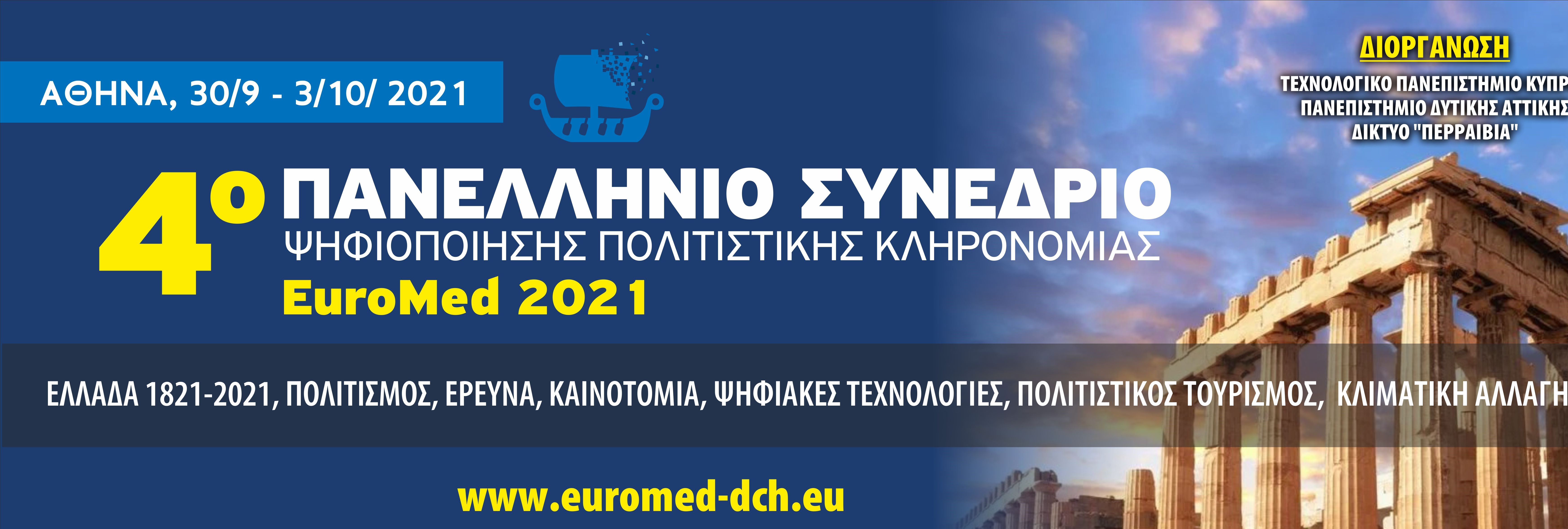 Έντονο είναι το ενδιαφέρον της επιστημονικής κοινότητας για το 4ο Πανελλήνιο Συνέδριο Ψηφιοποίησης Πολιτιστικής Κληρονομιάς-EuroMed 2021, όπου φέτος λόγω κορωνοϊού, θα γίνει διαδικτυακά, από τις εγκαταστάσεις του Πανεπιστημίου Δυτικής Αττικής, σημειώνοντας ρεκόρ συμμετοχών, όπως αναφέρεται σε Δελτίο Τύπου. Το Συνέδριο θα πραγματοποιηθεί από τις από 30 Σεπτεμβρίου έως τις 3 Οκτωβρίου 2021, με Φορείς διοργάνωσης το Τεχνολογικό Πανεπιστήμιο Κύπρου, το Πανεπιστήμιο Δυτικής Αττικής και ο Πολιτιστικός Οργανισμός «Δίκτυο ΠΕΡΡΑΙΒΙΑ», και τελεί υπό την αιγίδα της ΑΕ της Προέδρου της Δημοκρατίας Κατερίνας Σακελλαροπούλου και της Α.Θ. Παναγιότητος του Οικουμενικού Πατριάρχου Κωνσταντινουπόλεως κ.κ. Βαρθολομαίου, ενώ έχει και την υποστήριξη του Υπουργείου Πολιτισμού και Αθλητισμού, της Κυπριακής Πρεσβείας στην Ελλάδα ,του Πανεπιστημίου Θεσσαλίας, πολλών παγκόσμιων επιστημονικών Οργανισμών.