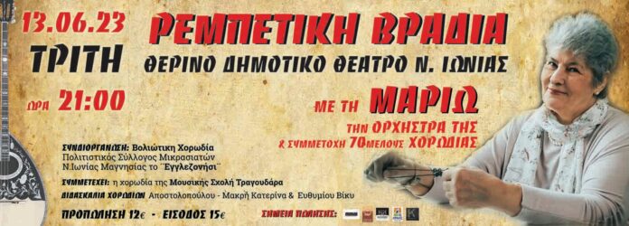 Η Βολιώτικη Χορωδία και ο Πολιτιστικός Σύλλογος Μικρασιατών Ν. Ιωνίας Μαγνησίας το «Εγγεζονήσι» διοργανώνουν μία ξεχωριστή ρεμπέτικη βραδιά με τη Μαριώ, την Τρίτη 13 Ιουνίου στις 21:00 στο θερινό Δημοτικό Θέατρο Ν. Ιωνίας. Μαζί με τη Μαριώ και την ορχήστρα της θα εμφανιστεί 70μελης χορωδία.
