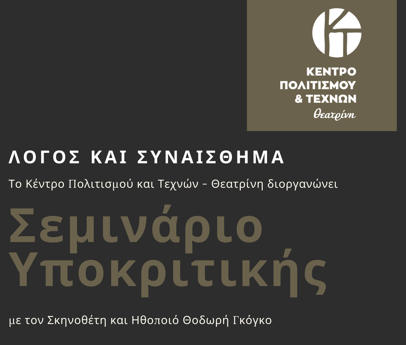 Το Κέντρο Πολιτισμού και Τεχνών «Θεατρίνη» διοργανώνει σεμινάριο υποκριτικής με τον σκηνοθέτη και ηθοποιό Θοδωρή Γκόγκο το Σάββατο 14 Μαΐου και ώρα 11.00πμ. Το σεμινάριο απευθύνεται σε επαγγελματίες και ερασιτέχνες ηθοποιούς αλλά και σε ανθρώπους που θέλουν να ανακαλύψουν τα μυστικά και τους κώδικες του θεάτρου.