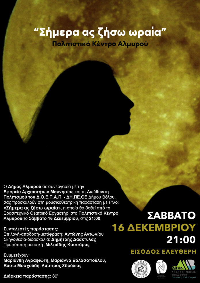 Το Ερασιτεχνικό Θεατρικό Εργαστήρι,που υπάγεται στη Διεύθυνση Πολιτισμού του Δ.Ο.Ε.Π.Α.Π. -ΔΗ.ΠΕ.ΘΕ. Δήμου Βόλου, παρουσιάζει τη μουσικοθεατρική παράσταση με τίτλο «Σήμερα ας ζήσω ωραία», βασισμένη σε ποιήματα της Παλατινής Ανθολογίας. Η παράσταση, η οποία παρουσιάστηκε ήδη με επιτυχία στον κήπο του Αθανασάκειου Αρχαιολογικού Μουσείου Βόλου, επρόκειτο να δοθεί στην ετήσια εκδήλωση που διοργανώνει κάθε Σεπτέμβρη ο Δήμος Αλμυρού με την Εφορεία Αρχαιοτήτων Μαγνησίας στον αρχαιολογικό χώρο της Άλου. Όμως εξαιτίας των ακραίων καιρικών φαινομένων αναβλήθηκε και παρουσιάζεται αυτή τη φορά στο Πολιτιστικό Κέντρο του Δήμου Αλμυρού, το Σάββατο 16 Δεκεμβρίου 2023, στις 9:00μμ. Το έργο ανεβαίνει και πάλι υπό την αιγίδα του Δήμου Αλμυρού, σε συνεργασία με την Εφορεία Αρχαιοτήτων Μαγνησίας και τη Διεύθυνση Πολιτισμού του Δ.Ο.Ε.Π.Α.Π.- ΔΗ.ΠΕ.ΘΕ. Δήμου Βόλου.
