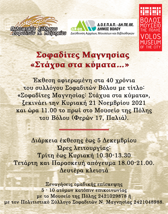 Αφιερωμένη στην πληθυσμιακή ομάδα των Σοφαδιτών Βόλου είναι η περιοδική έκθεση «Σοφαδίτες Μαγνησίας: Στάχυα στα κύματα», που θα ανοίξει την Κυριακή 21 Νοεμβρίου και ώρα 11.00 το πρωί στο Μουσείο της Πόλης του Βόλου (Φερών 17, Παλιά).