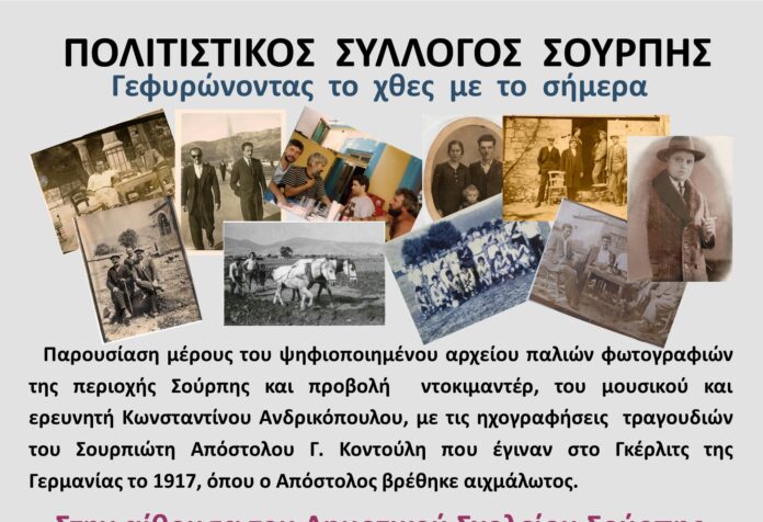 Στην εκδήλωση θα γίνει η παρουσίαση μέρους του ψηφιοποιημένου αρχείου παλιών φωτογραφιών της περιοχής Σούρπης και προβολή ντοκιμαντέρ, του μουσικού και ερευνητή Κωνσταντίνου Ανδρικόπουλου, με τις ηχογραφήσεις τραγουδιών του Σουρπιώτη Απόστολου Γ. Κοντούλη που έγιναν στο Γκέρλιτς της Γερμανίας το 1917, όπου ο Απόστολος βρέθηκε αιχμάλωτος. Οι ηχογραφήσεις σε κυλίνδρους κεριού από την Πρωσική Επιτροπή Φωνογράφου, στο Γκέρλιτς (Görlitz) της Γερμανίας, έγιναν το καλοκαίρι του 1917 με τον στρατιώτη του Δ΄ Σώματος Στρατού Απόστολο Κοντούλη.