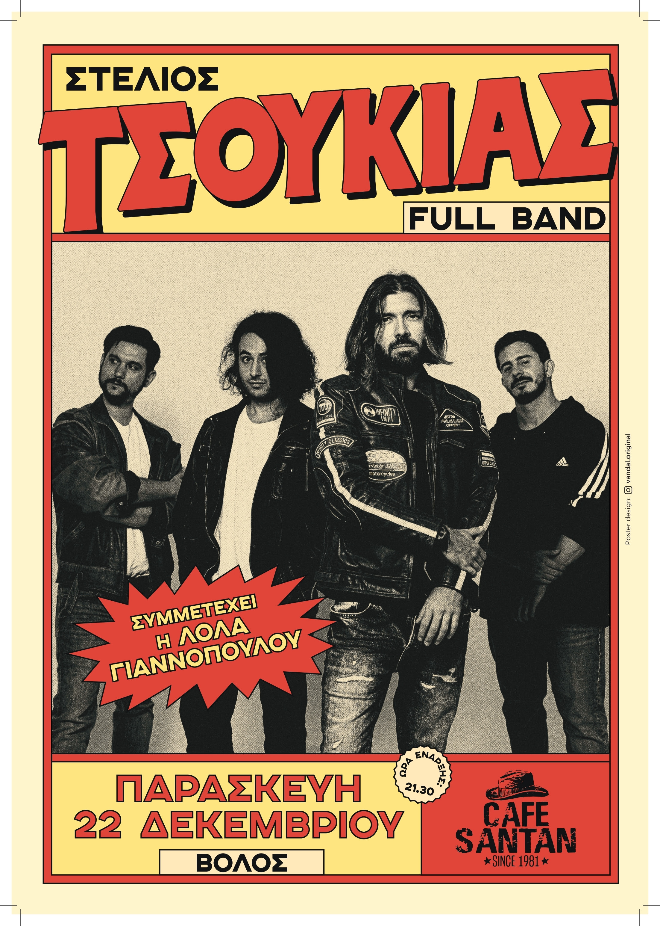 Την Παρασκευή 22 Δεκεμβρίου, ο Στέλιος Τσουκιάς έρχεται για πρώτη φορά στον Βόλο στο Cafe Santan, με full band που απαρτίζεται από νέους μουσικούς. Στο ανανεωμένο του πρόγραμμα παρουσιάζει τραγούδια από τα δύο προσωπικά του άλμπουμ (ΑΓΙΟΣ ΨΕΥΤΗΣ, ΚΟΙΤΑΖΩ ΕΞΩ), νέα τραγούδια που έγραψε το καλοκαίρι και επιλεγμένα κομμάτια από την ελληνική δισκογραφία, όλα όσα τον έχουν επηρεάσει και έχουν καθορίσει την αισθητική του.