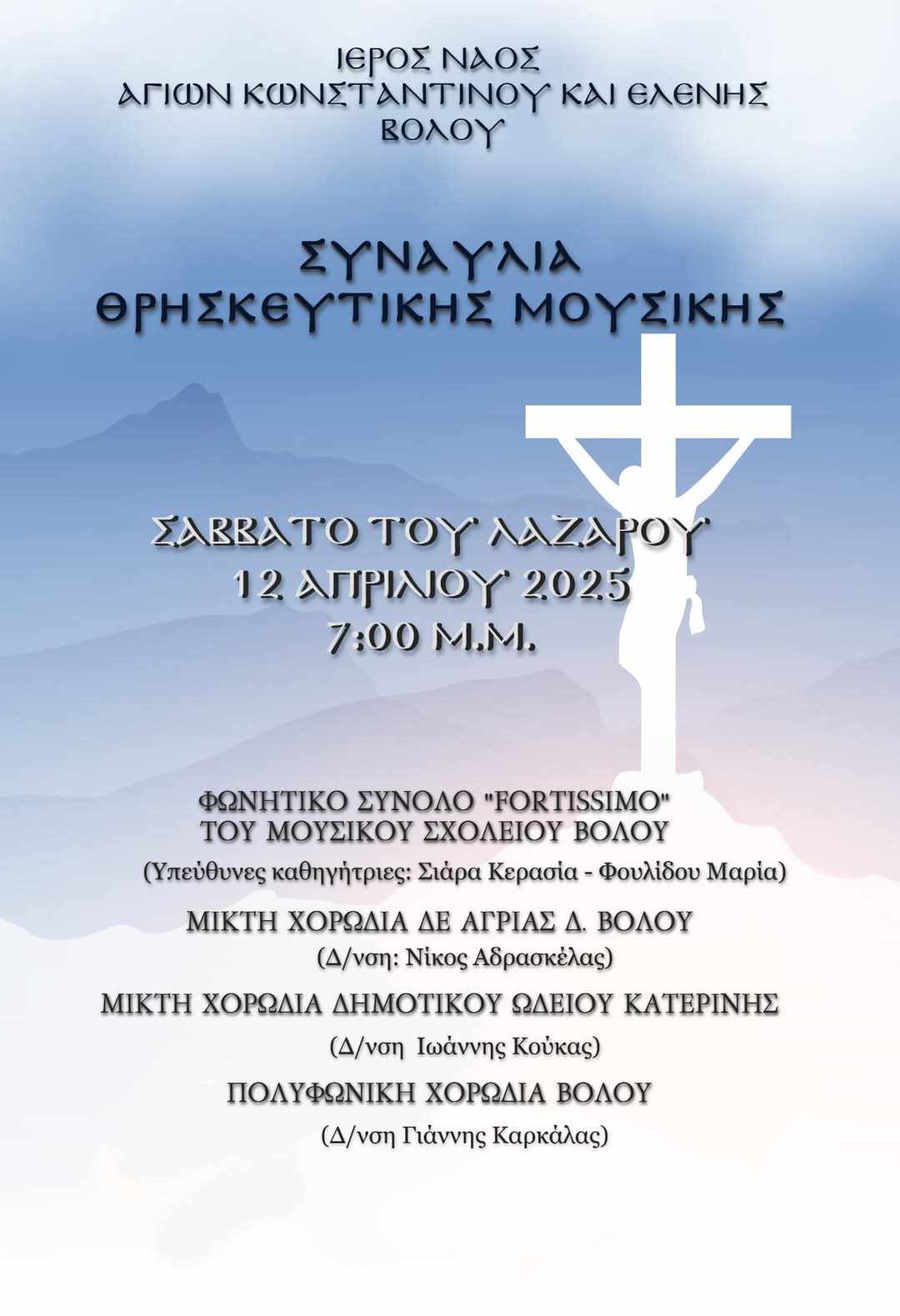 Η Χορωδία θα εμφανιστεί στη Συναυλία Θρησκευτικής Μουσικής, που διοργανώνει το Σάββατο 12 Απριλίου στις 7.00 μ.μ. στον Ι.Ν. Αγίου Κωνσταντίνου και Ελένης στον Βόλο η Πολυφωνική Χορωδία Βόλου. Μέσα στην κατανυκτική ατμόσφαιρα του ιερού ναού η χορωδία θα αποδώσει μελωδίες που θα εισαγάγουν χορωδούς και κοινό στο πνεύμα της Μεγάλης Εβδομάδας και θα προετοιμάσει το κοινό για τη μεγάλη γιορτή της Ανάστασης.