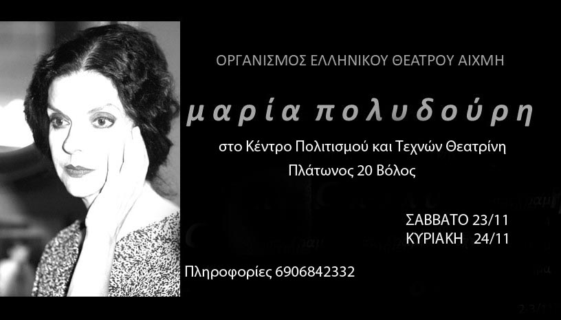 Το Κέντρο Πολιτισμού και Τεχνών «Θεατρίνη», που βρίσκεται στην οδό Πλάτωνος 20 στον Βόλο, υποδέχεται το θεατρικό έργο «Μαρία Πολυδούρη», για δύο μόνο παραστάσεις, σήμερα Σάββατο 23 Νοεμβρίου ώρα 21.15 και την Κυριακή 24 Νοεμβρίου ώρα 20:00.