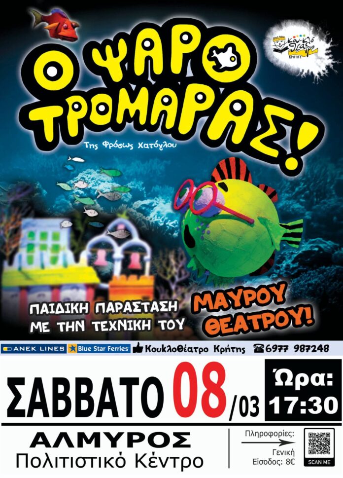 Το Κουκλοθέατρο Κρήτης παρουσιάζει την παραγωγή του “Ο Ψαροτρομάρας“ το Σάββατο 8 Μαρτίου στο Πολιτιστικό Κέντρο Αλμυρού στις 17:30 με γενική είσοδος 8 ευρώ.