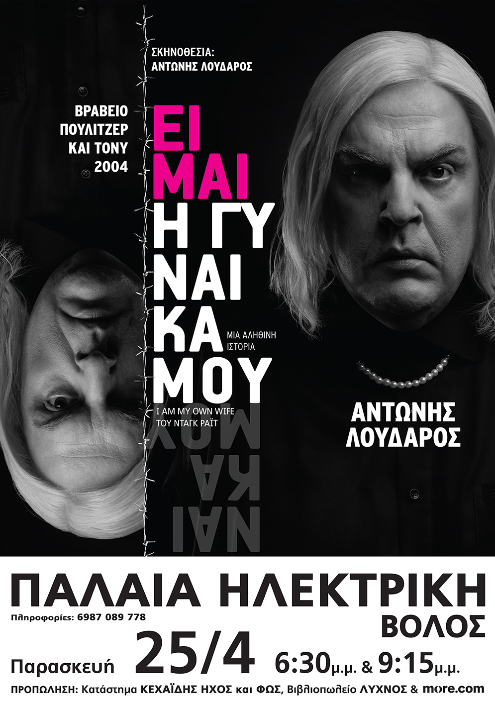 Με τη διπλή ιδιότητα του ερμηνευτή – σκηνοθέτη, ο ταλαντούχος ηθοποιός Αντώνης Λουδάρος, μετά τις καθηλωτικές παραστάσεις στην Αθήνα, φέρνει το βραβευμένο με Pulitzer και Tony θεατρικό μονόλογο του Doug Wright, «Είμαι η γυναίκα μου» στον Βόλο την Παρασκευή 25 Απριλίου στις 6:30μ.μ. και στις 9:15 μ.μ στο Θέατρο της Παλιάς Ηλεκτρικής.