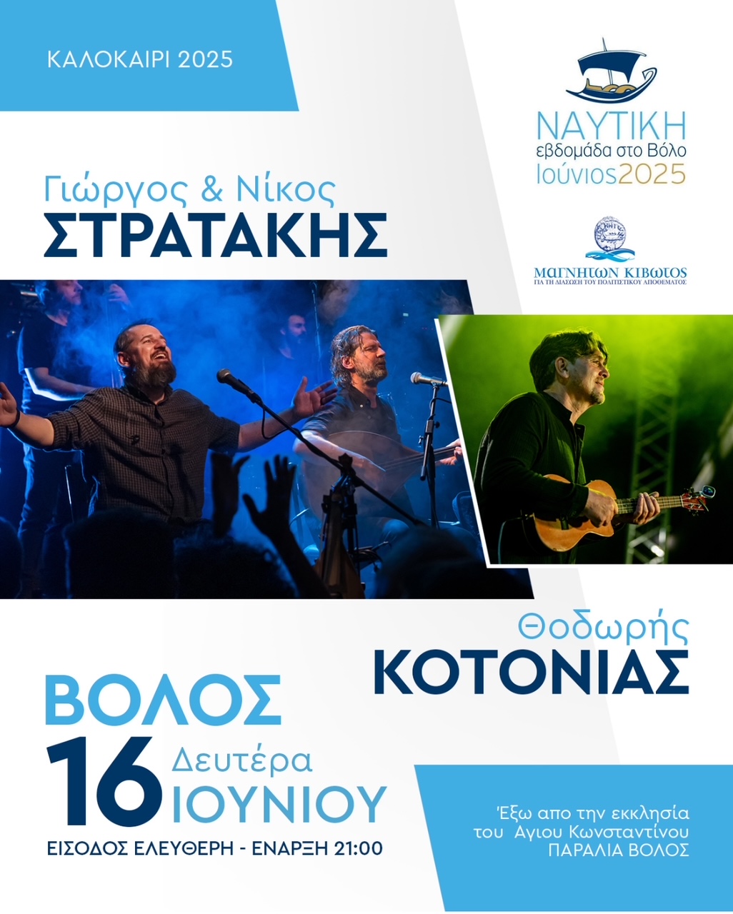Οι Θοδωρής Κοτονιάς, ο Γιώργος και ο Νίκος Στρατάκης, με την ενέργεια της λύρας και τη δύναμη του λαούτου, υπόσχονται μία συναυλία – κατάθεση ψυχής σήμερα Δευτέρα 16 Ιουνίου στις 9 το βράδυ στο προαύλιο του Ιερού Ναού του Αγίου Κωνσταντίνου, στην Παραλία του Βόλου, στα πλαίσια της «Ναυτικής Εβδομάδας στο Βόλο», που διοργανώνεται από τη «Μαγνήτων Κιβωτό» της Μητρόπολης Δημητριάδος και είναι αφιερωμένη στην Κρήτη.