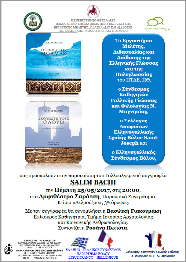 Το Εργαστήριο Μελέτης, Διδασκαλίας και Διάδοσης της Ελληνικής Γλώσσας και της Πολυγλωσσίας του ΠΤΔΕ, ΠΘ, ο Σύνδεσμος Καθηγητών Γαλλικής Γλώσσας και Φιλολογίας Ν. Μαγνησίας, ο Σύλλογος Αποφοίτων Ελληνογαλλικής Σχολής Βόλου Saint-Joseph και ο Ελληνογαλλικός Σύνδεσμος Βόλου, διοργάνωσαν την παρουσίαση του Γαλλοαλγερινού συγγραφέα Salim Bachi την Πέμπτη 25 Μαΐου 2017, στις 20:00, στο Αμφιθέατρο Σαράτση, Παραλιακό Συγκρότημα, Κτίριο «Δελμούζου», 3ος όροφος.