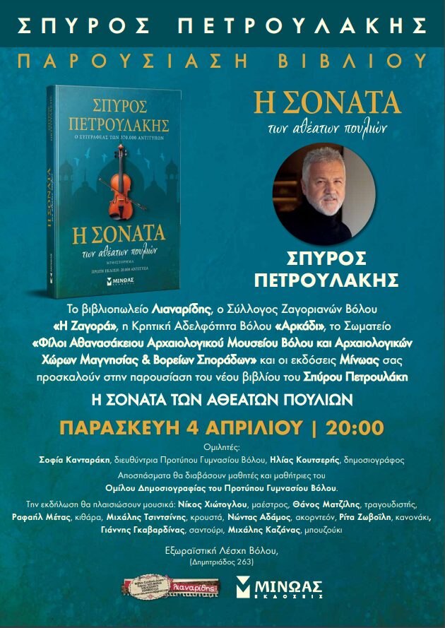 Το βιβλιοπωλείο Λιαναρίδης, ο Σύλλογος Ζαγοριανών Βόλου «Η Ζαγορά», η Κρητική Αδελφότητα Βόλου «Αρκάδι», το Σωματείο «Φίλοι Αθανασάκειου Αρχαιολογικού Μουσείου Βόλου και Αρχαιολογικών Χώρων Μαγνησίας & Βορείων Σποράδων» και οι εκδόσεις Μίνωας διοργανώνουν την παρουσίαση του νέου βιβλίου του Σπύρου Πετρουλάκη με τίτλο «Η Σονάτα των αθέατων πουλιών», την Παρασκευή 4 Απριλίου στις 20:00 στην Εξωραϊστική Λέσχη Βόλου.